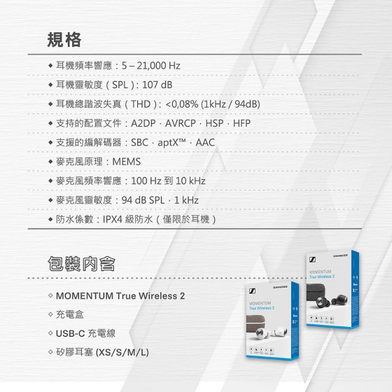 全新的 MOMENTUM True Wireless 2 真無線藍牙耳機,延續了一代經典的時尚外觀,推出黑白雙色。採用藍牙5.1規範,傳輸更穩定、電力表現更佳。優異的 7mm 高效能動圈單體,提供了完美的音質保證,全新加入主動抗噪功能搭配 IPX4 防水等級,讓 MOMENTUM True Wireless 2 成為了全方位的行動音樂夥伴。